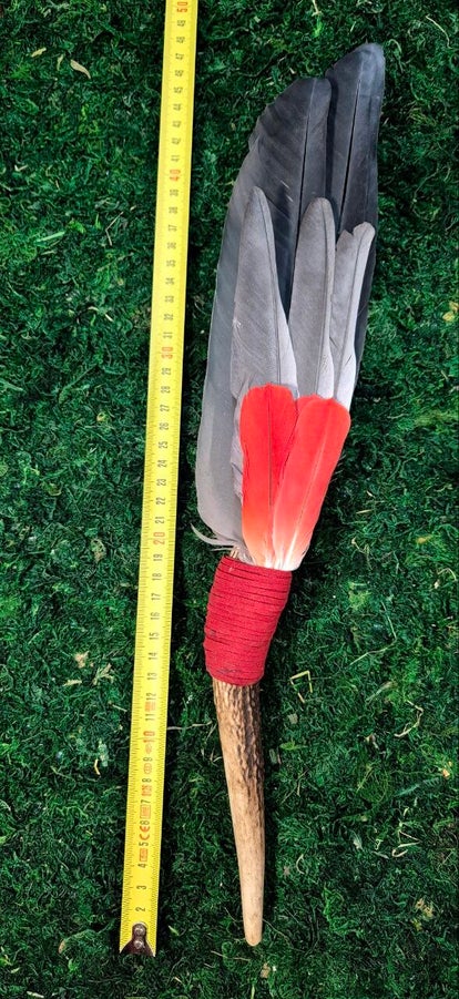 Räucher Fächer von Papagylo's mit Graureiher, Rosakakadu und Graupapagei Federn mit einem Geweih Horn als Griff